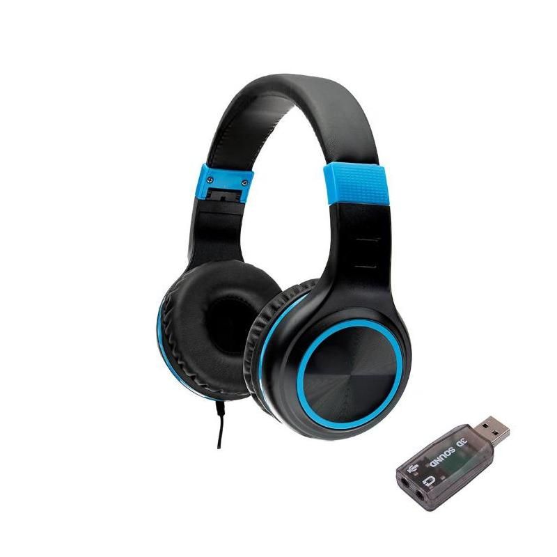 Casti Spacer, cu fir, standard, utilizare multimedia, microfon pe fir, pliabile, banda ajustabila, conectare prin adaptor USB 2.0 sau Jack 3.5 mm x 2, negru&albastru - Flanco | PIXER Shopping